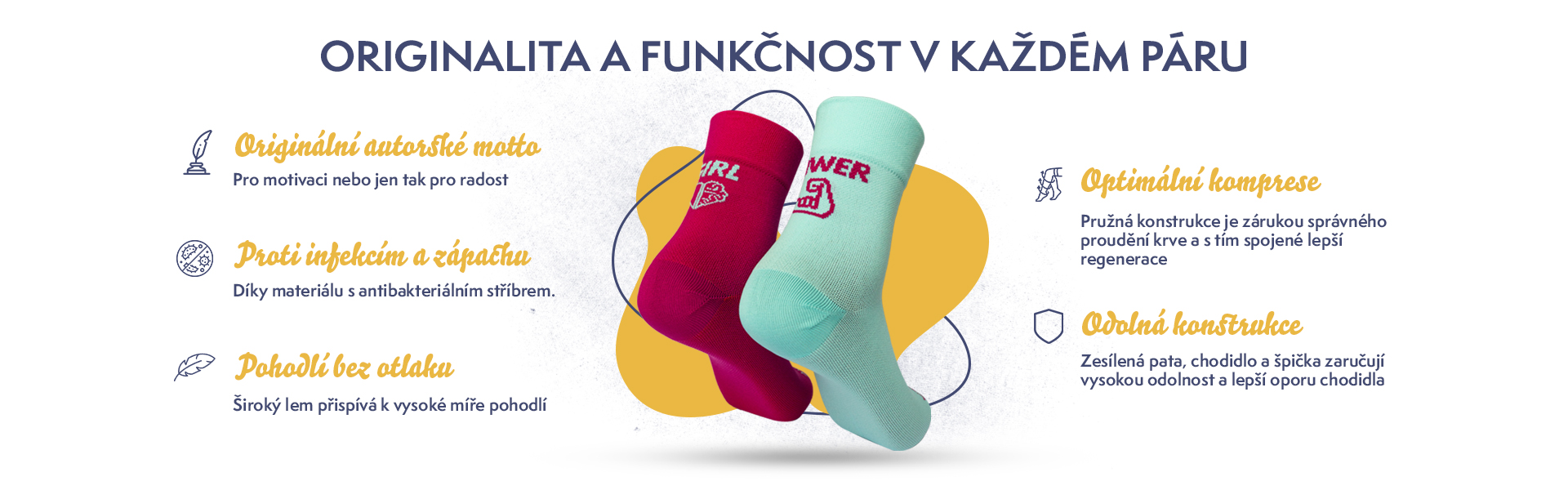 Pohodlné kvalitní provedení, které nosí i ironmanky a ironmani! Svěží barvy a jedinečné motto, které ti bude při sportu krýt paty! Celé ponožky vznikají u nás v ČR a jsou zabaleny do designových krabiček.