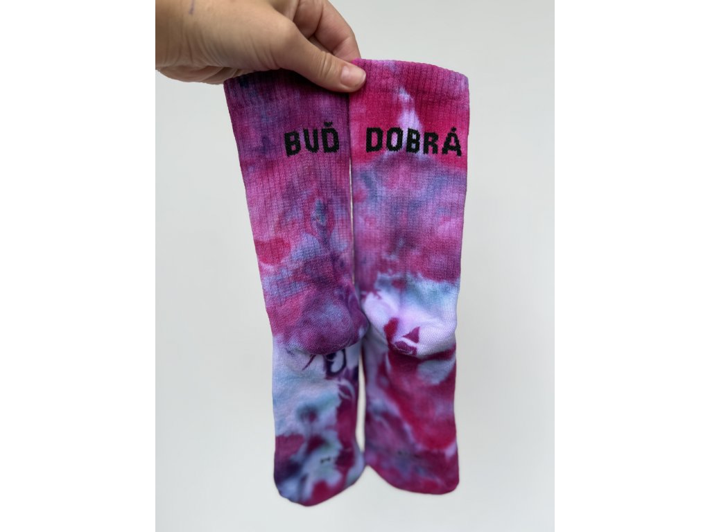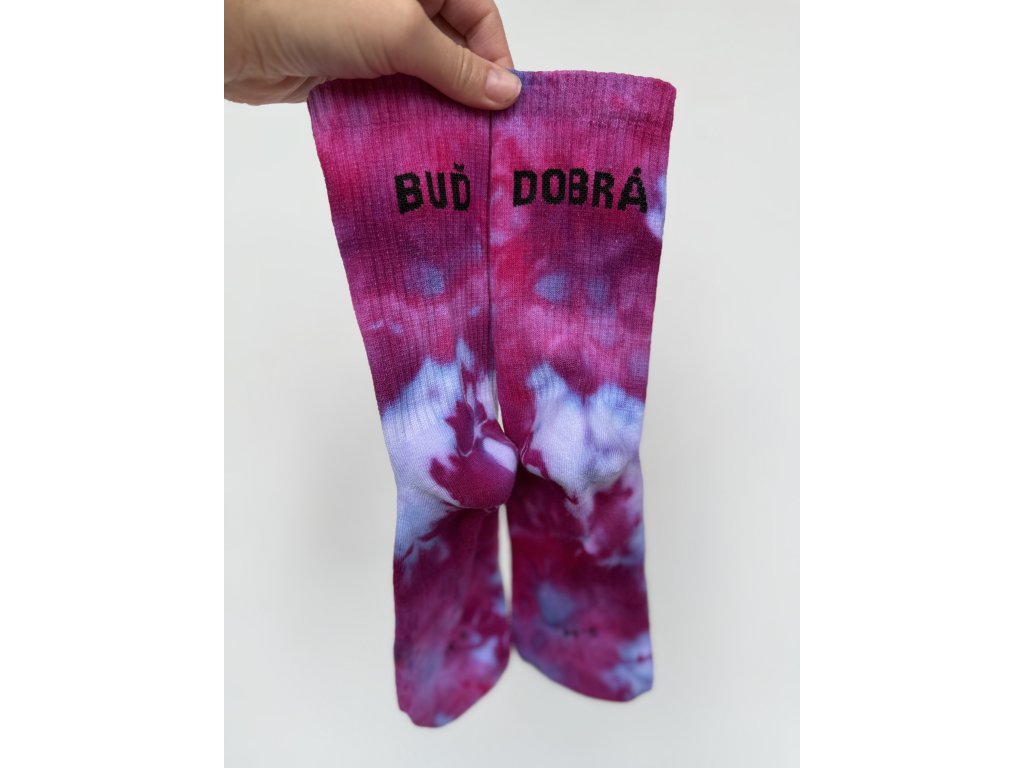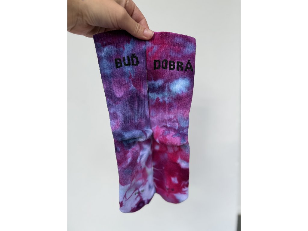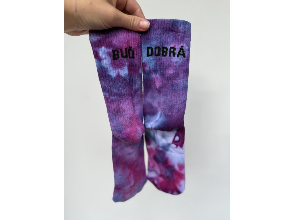Růžovo-fialovo-modré tmavší galaxie jsou bavlněné ponožky s mottem BUĎ DOBRÁ obarveny batikou na jedinečné kousky, kde je každý pár originál. Jsou tak akorát vysoké a neuvěřitelně pohodlné díky měkoučkému chodidlu a pružnému žebrování na lýtko.
