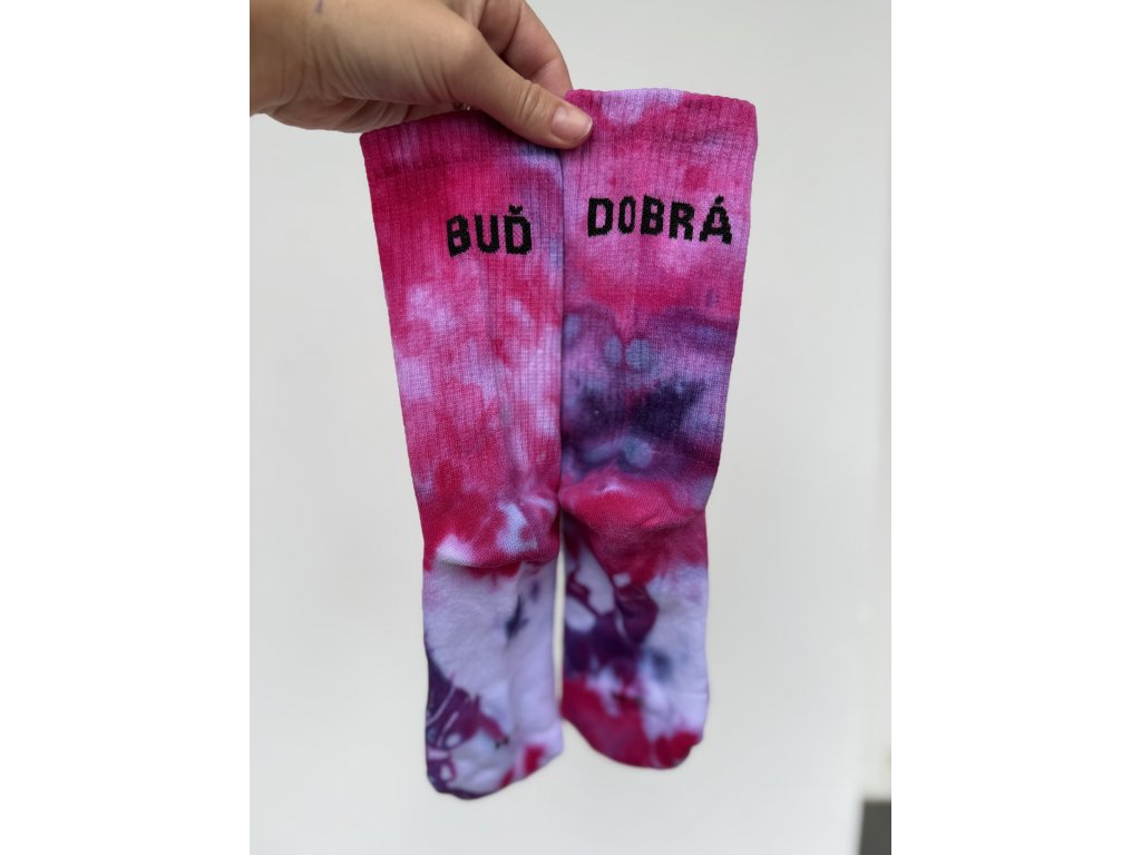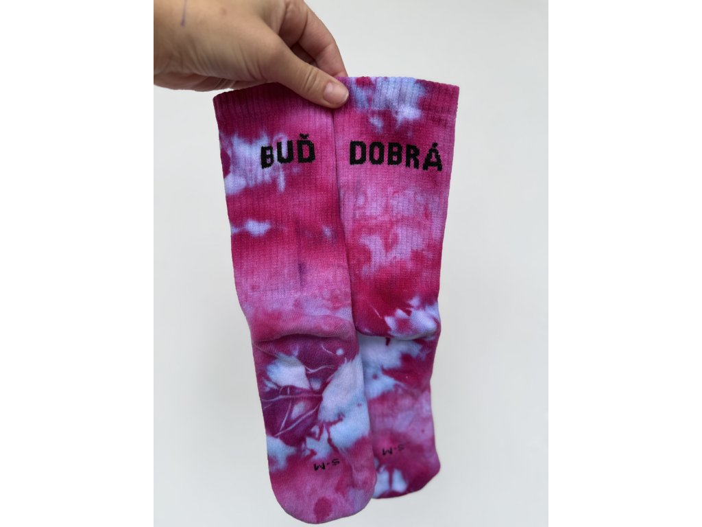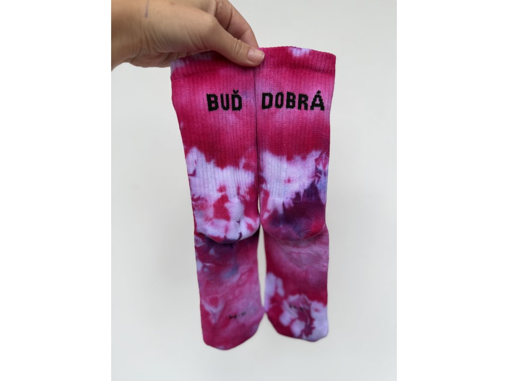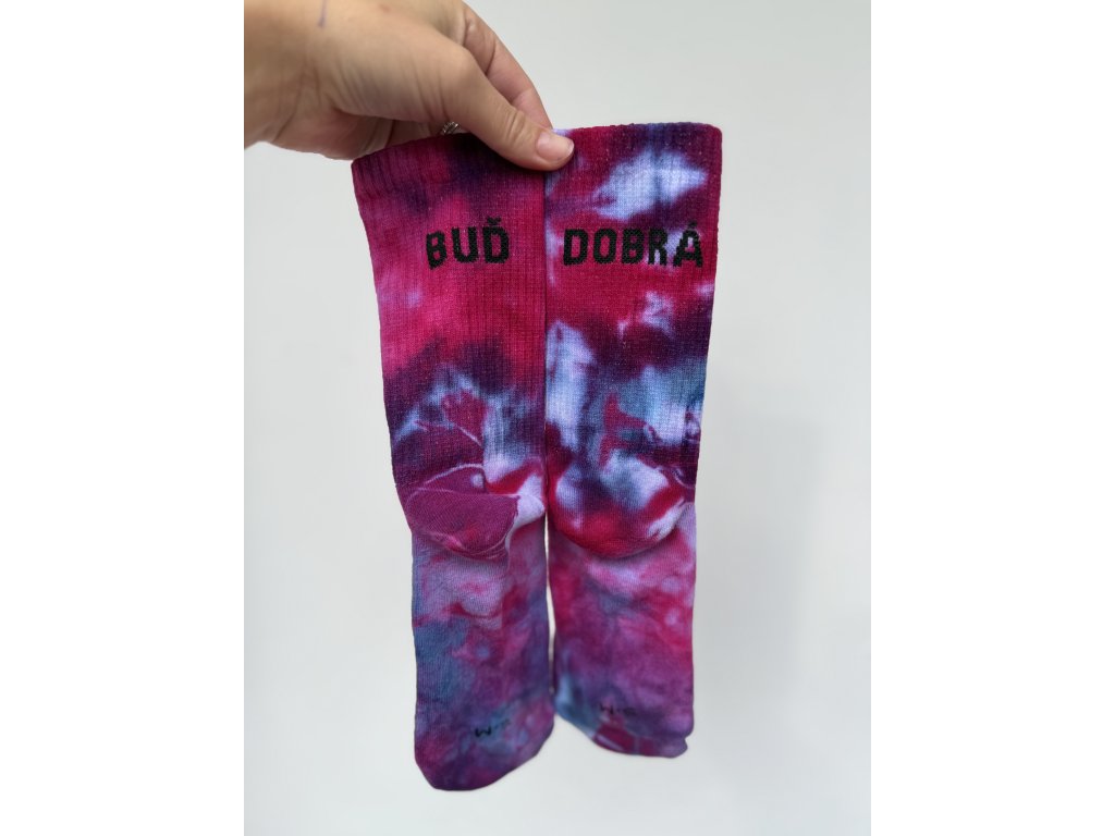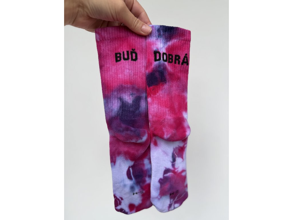 Růžovo-fialovo-modré tmavší galaxie jsou bavlněné ponožky s mottem BUĎ DOBRÁ obarveny batikou na jedinečné kousky, kde je každý pár originál. Jsou tak akorát vysoké a neuvěřitelně pohodlné díky měkoučkému chodidlu a pružnému žebrování na lýtko.