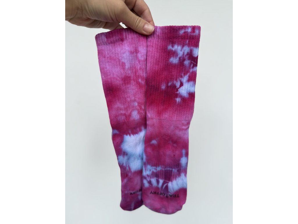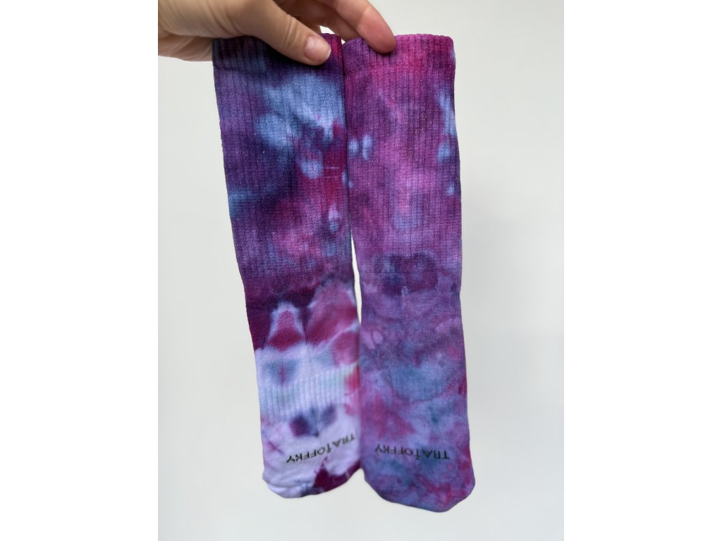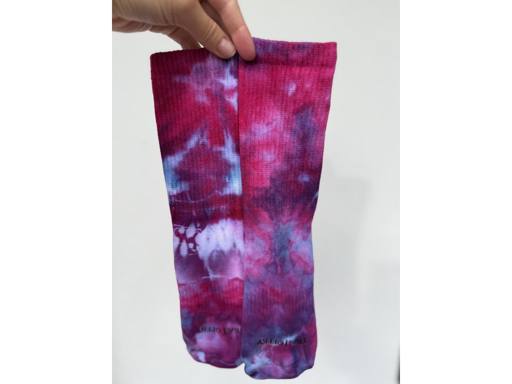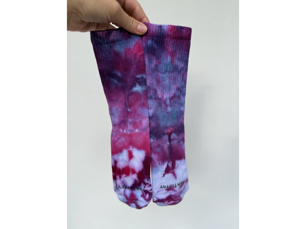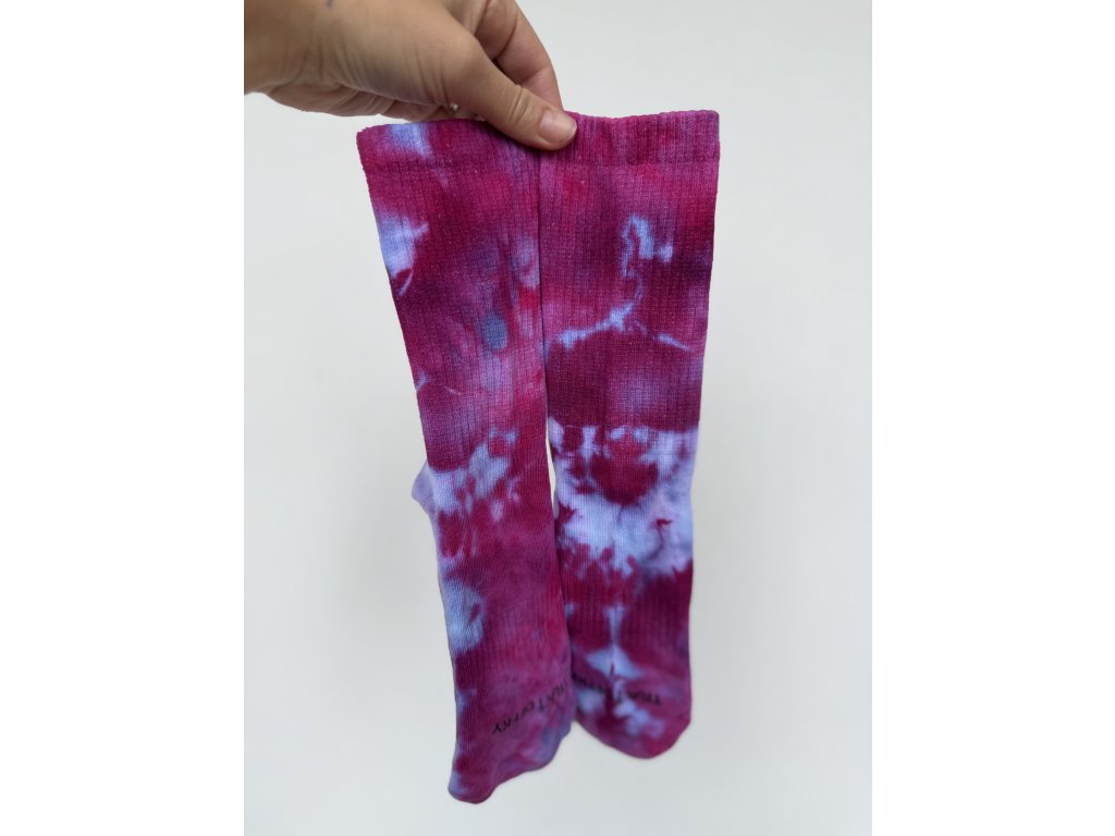 Batikované ponožky jsou barveny mnou a to práškovými barvami Jacquard Procion (netoxická barva) studenou metodou na bázi chemické reakce. Aktualni barvy na fotkach - ruzove, svetlejsi galaxie a tmavsi galaxie :)
