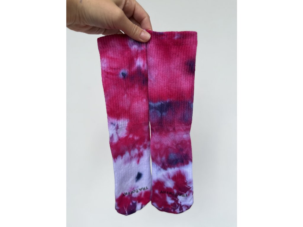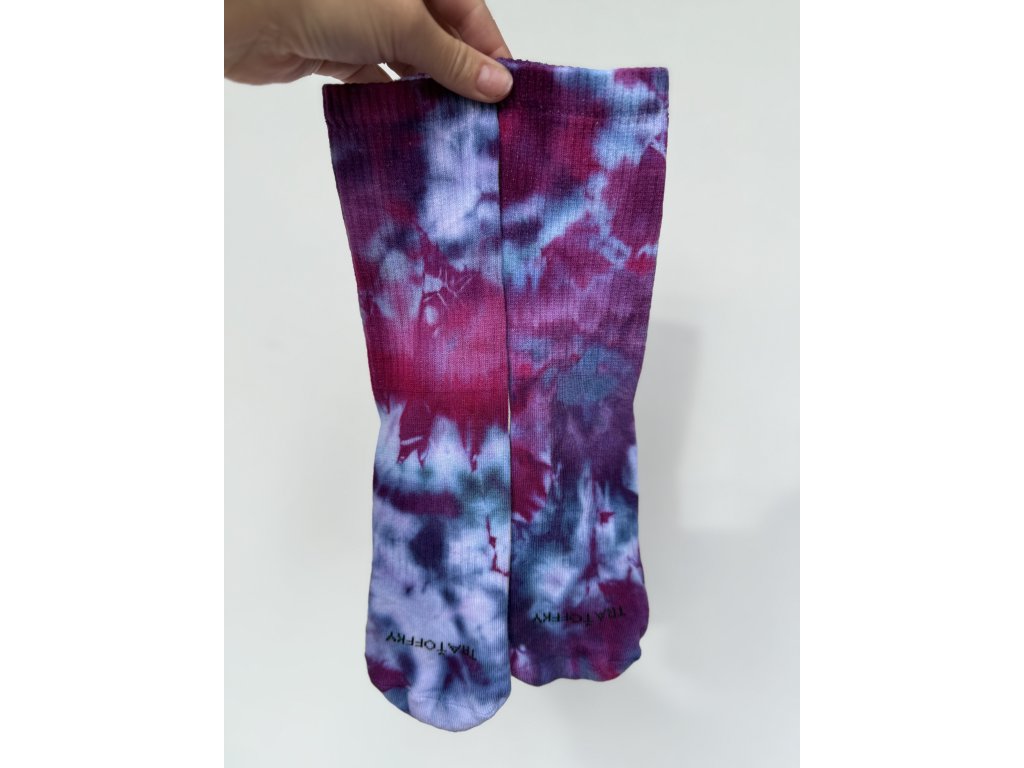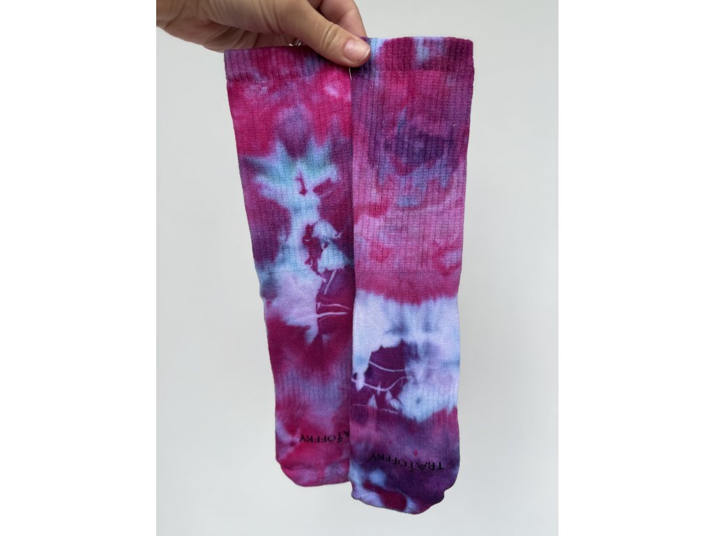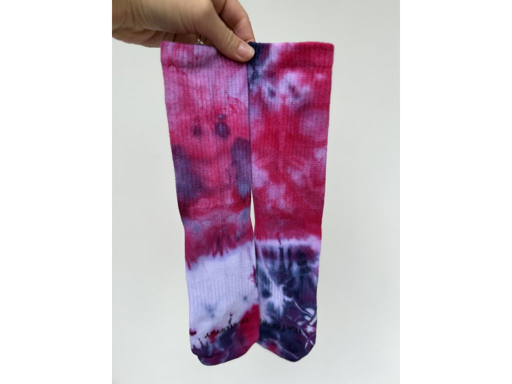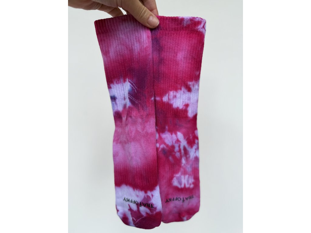 Batikované ponožky jsou barveny mnou a to práškovými barvami Jacquard Procion (netoxická barva) studenou metodou na bázi chemické reakce. Aktualni barvy na fotkach - ruzove, svetlejsi galaxie a tmavsi galaxie :)