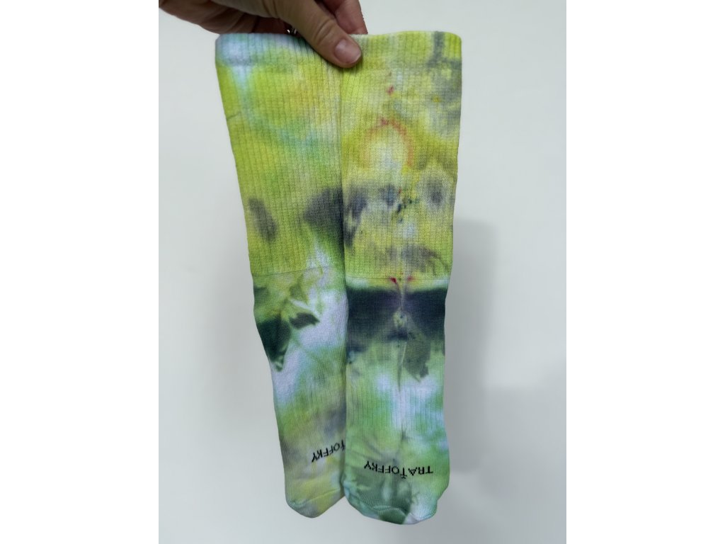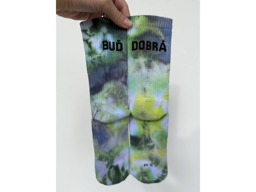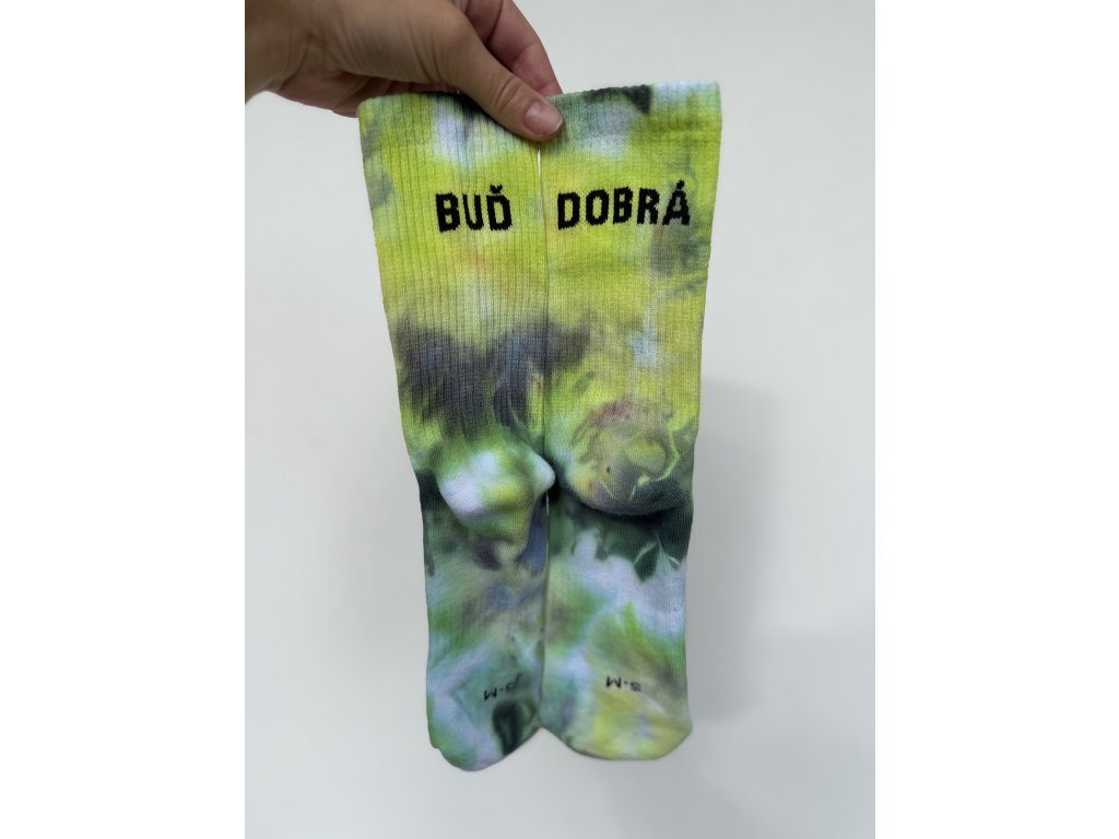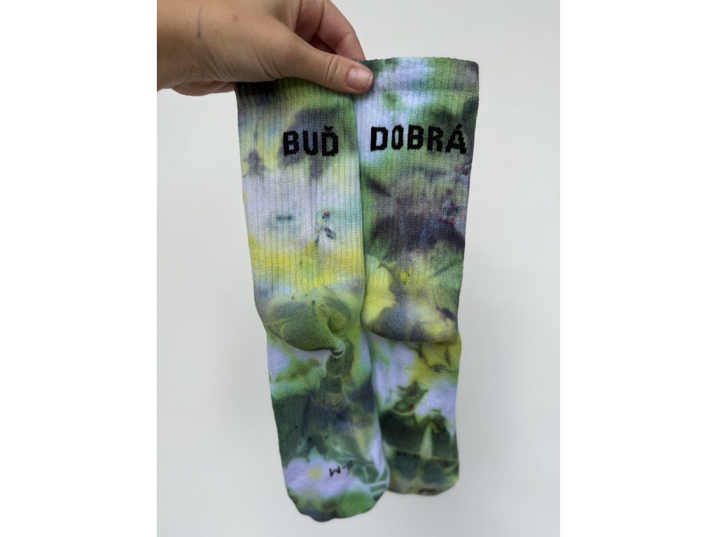 Zelené bavlněné ponožky s mottem BUĎ DOBRÁ obarveny batikou na jedinečné kousky, kde je každý pár originál. Jsou tak akorát vysoké a neuvěřitelně pohodlné díky měkoučkému chodidlu a pružnému žebrování na lýtko.