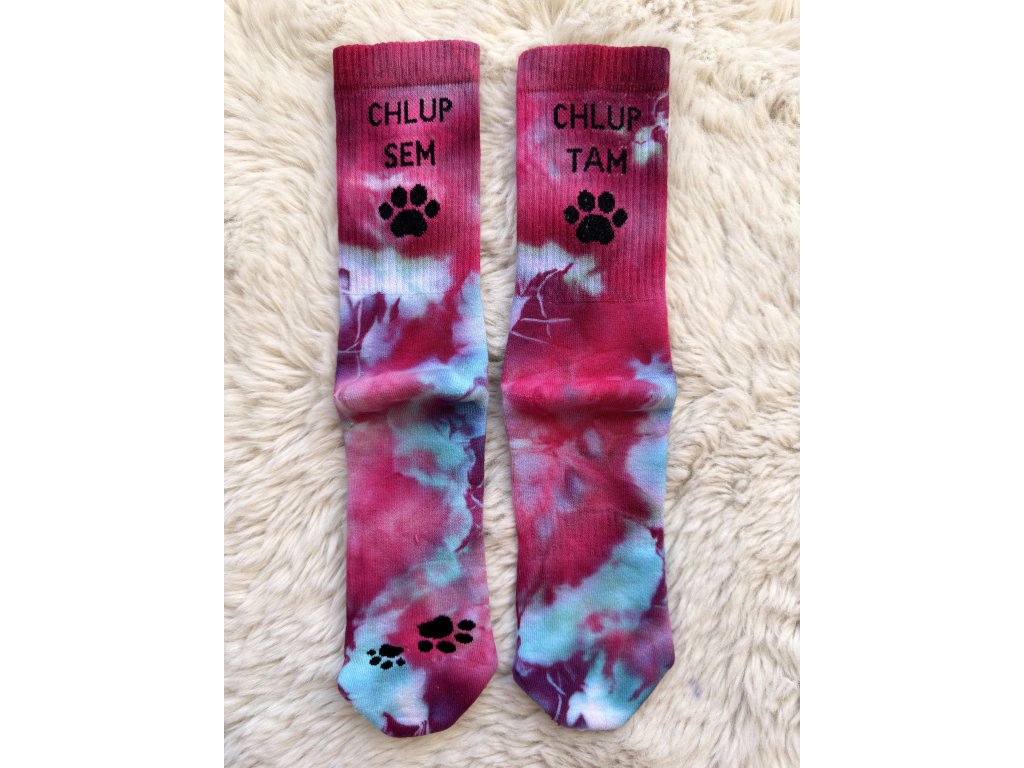 Růžovo-fialovo-modré tmavší galaxie jsou bavlněné ponožky s mottem CHLUP SEM CHLUP TAM obarveny mojí batikou na jedinečné kousky, kde je každý pár originál. Jsou tak akorát vysoké a neuvěřitelně pohodlné díky měkoučkému chodidlu a pružnému žebrování na lýtko.