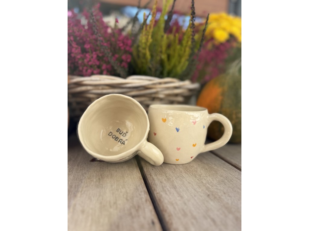 Ručně modelovaný keramický hrnek z dílny ERITY s textem BUĎ DOBRÁ na dně šálku a barevnými srdíčky vně pro kafíčkový chvilky. Objem cca 300 ml.