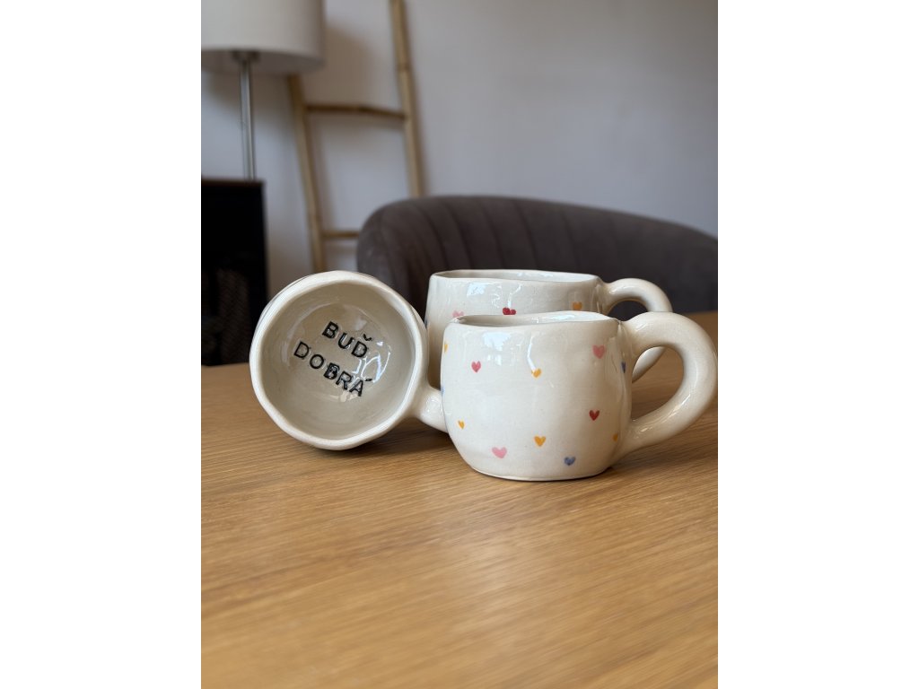 - Ručně modelovaný keramický hrnek z dílny ERITY s textem BUĎ DOBRÁ na dně šálku pro kafíčkový chvilky.