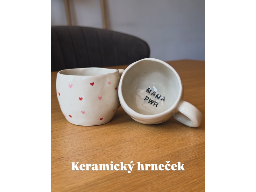 Ručně modelovaný keramický hrnek z dílny ERITY s textem MAMA PWR na dně šálku pro kafíčkový chvilky. Růžovo červená srdíčka na vnější straně. Objem cca 150 ml.