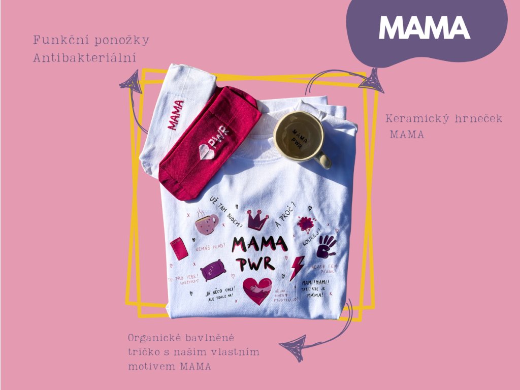 MAMA PWR kombo pohodlného trička, funkčních ponožek a keramického hrnečku s motivem na dně! Výzbroj do každodenního multitaskingového maratonu pro mámy ! :-)