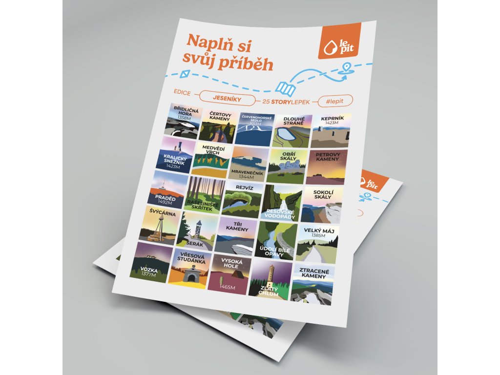 Samolepky na lahev lepit s autorskými kresbami 25 známých míst v Jeseníkách. Storylepky Jeseníky jsou odolné samolepky na lahev pro originální zaznamenání vrcholů, vzpomínek a zážitků na tvoji lahev.