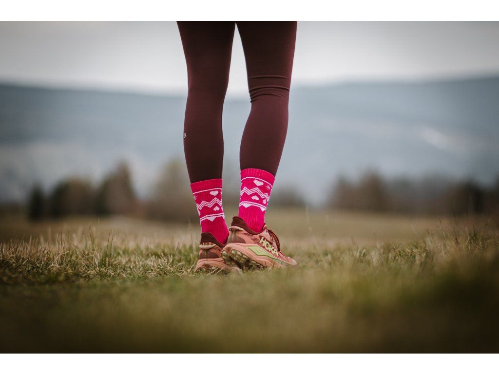 Zima není důvod zpomalit. Zima je důvod se obléct chytře. A s námi i hezky :-) S touto myšlenkou vznikly zimní Traťoffky. Na zimní sporty, se srdíčkovým vzorkem, který bude vykukovat z bot jsou úplný HYGGE kousek. Funkční díky kombinaci merina a polyamidu, originální svým vzorem.