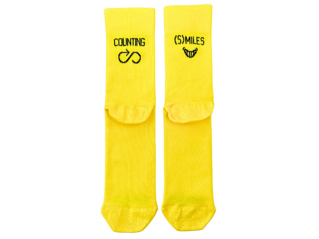 Ať máš rád vzdálenost 1, 10 nebo 100 km je na tobě. Co nás spojuje je láska k pohybu! Sportovní barevné antibakteriální ponožky na kolo a běh s mottem counting smiles. Oranžové zářivé, žluté a modré tyrkysové funkční ponožky.